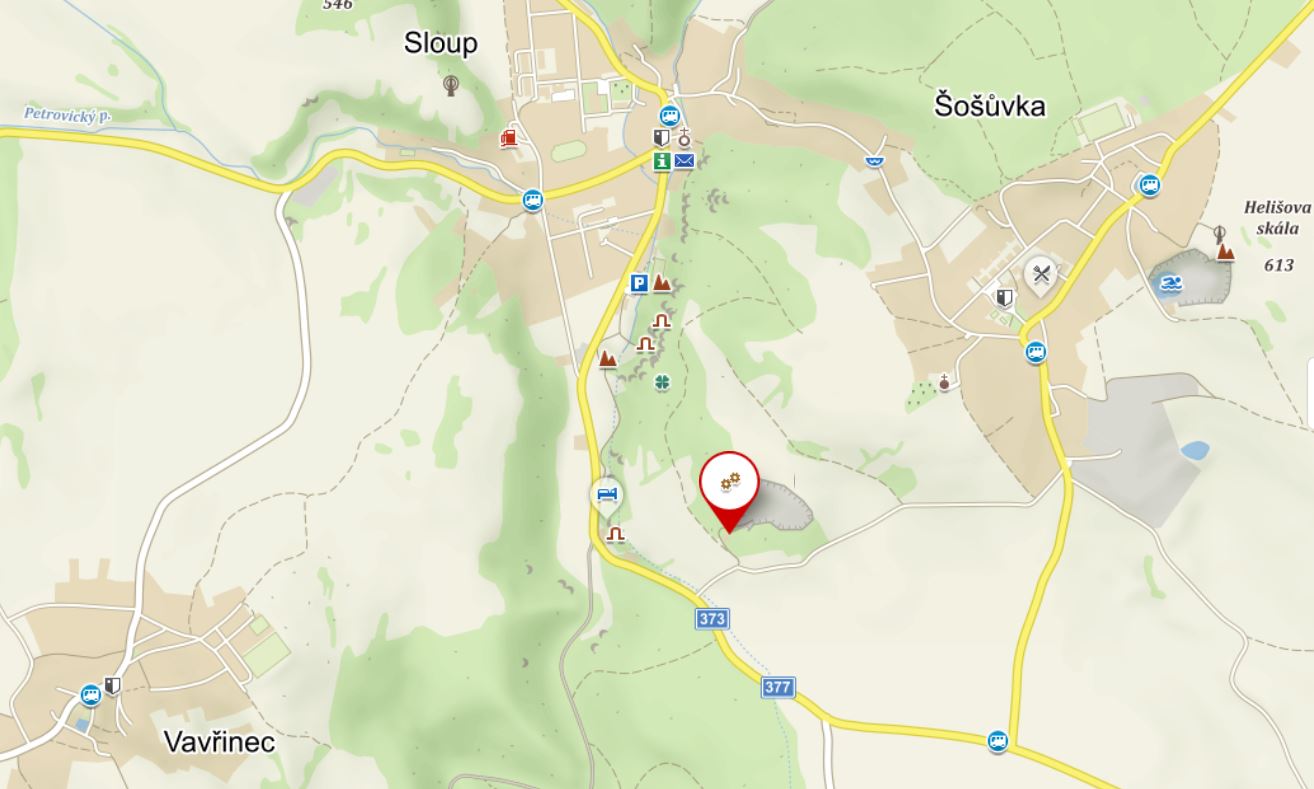 Vápenku na Bradinách označuje červené kolečko s ozubenými koly. Zdroj mapy: www.mapy.cz